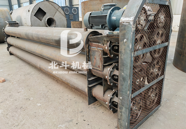 冷炭出料機可以達(dá)到冷卻物料的目的,減少占用空間。水冷內(nèi)螺旋輸送機包括進料單元、出料單元、筒體、冷卻單元、驅(qū)動單元和支撐單元。進料單元和出料單元分別設(shè)置在筒體兩端,驅(qū)動單元使筒體圍繞中心對稱軸旋轉(zhuǎn),支撐單元支撐筒體。筒體包括外筒體和內(nèi)筒體,進料單元附近的外筒體周圍設(shè)有一定長度的夾套,冷卻套筒從一端進水,從另一端排水,水和炭不接觸,提高了炭的品質(zhì),具有更好的冷炭效率,從而將成品炭的溫度降至常溫。